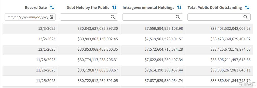 截至11月,美国国家总债务达38.4万亿美元,其中包括对社会保障信托基金、储蓄债券持有人等的欠款。