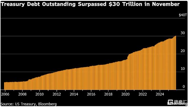美国国债总额首次突破30万亿美元大关——自2018年以来已增长逾一倍。