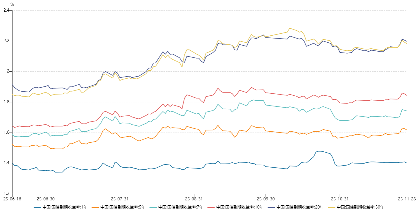上周,主要利率债收益率震荡上行。截至11月28日收盘,1Y、5Y、7Y国债分别报收1.4%、1.62%、1.74%,分别较前一周收盘变动-0.4BP、3BP、4BP;10Y、20Y、30Y国债分别报收1.84%、2.2%、2.18%,分别均较前一周收盘变动2BP、3.5BP、2BP。