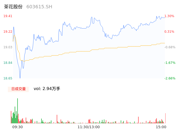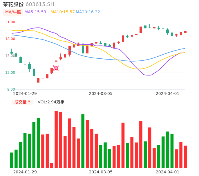 04月01日,茶花股份收报19.39,股价涨幅1.20%,成交金额5612.35万元,换手率1.22%。