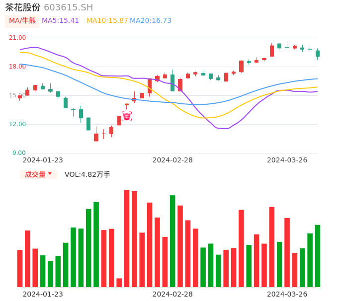 03月26日,茶花股份收报19.04,股价涨幅-3.79%,成交金额9238.56万元,换手率1.99%。
