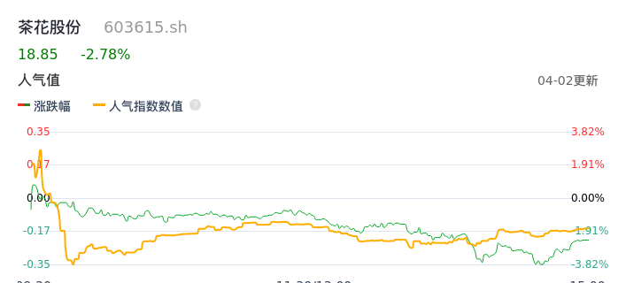 04月02日,茶花股份收报18.85,股价涨幅-2.78%,成交金额5157.88万元,换手率1.12%。