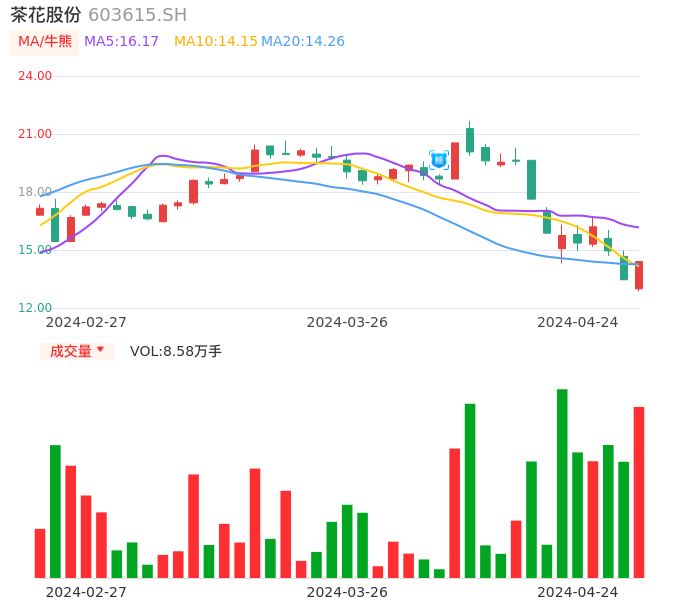 04月24日,茶花股份收报14.40,股价涨幅6.98%,成交金额1.20亿元,换手率3.55%。