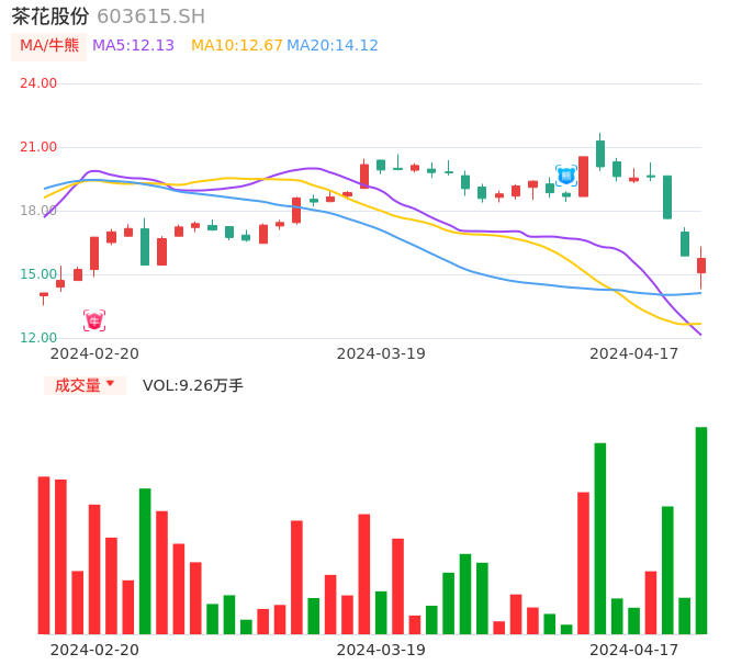 04月17日,茶花股份收报15.75,股价涨幅-0.76%,成交金额1.44亿元,换手率3.83%。