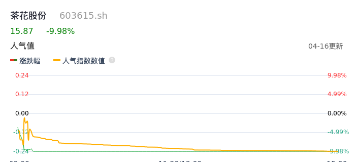04月16日,茶花股份收报15.87,股价涨幅-9.98%,成交金额5289.22万元,换手率1.36%。