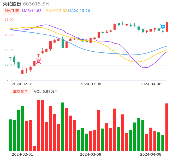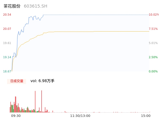 04月08日,茶花股份收报20.54,股价涨幅10.02%,成交金额1.40亿元,换手率2.89%。