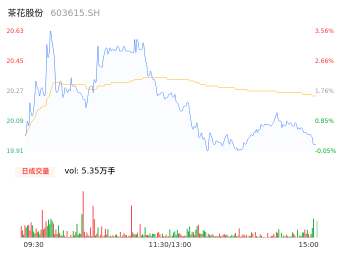 03月20日,茶花股份收报19.94,股价涨幅0.10%,成交金额1.08亿元,换手率2.21%。
