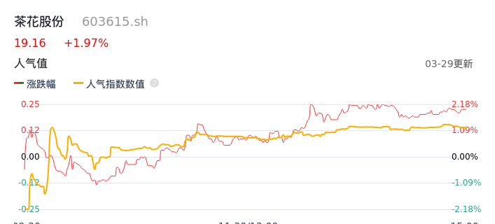 03月29日,茶花股份收报19.16,股价涨幅1.97%,成交金额6427.35万元,换手率1.40%。