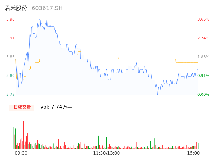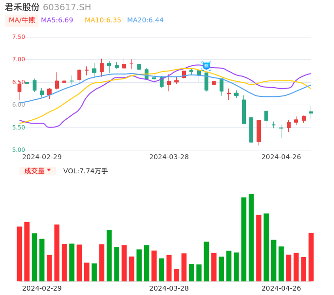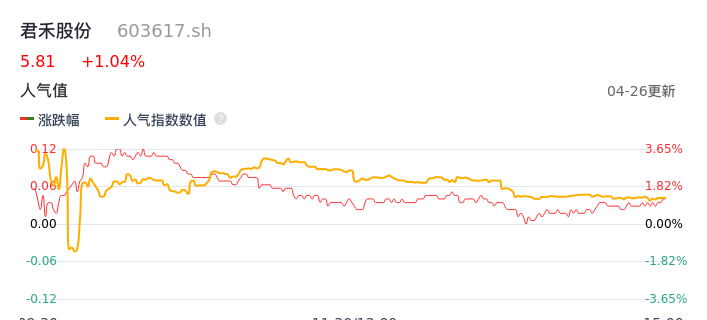 04月26日,君禾股份收报5.81,股价涨幅1.04%,成交金额4519.59万元,换手率2.02%。