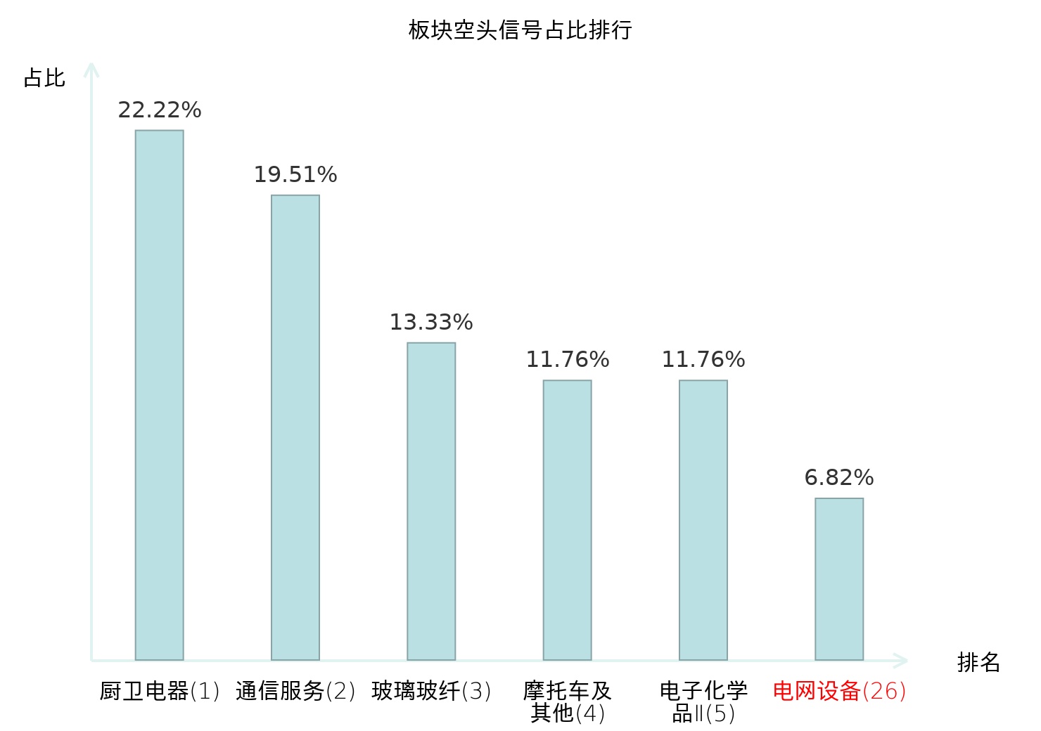全市场所有行业板块中主力空头信号占比排名中,厨卫电器板块位居第一。家电零部件Ⅱ板块名次提升最快,较昨日上升121位。