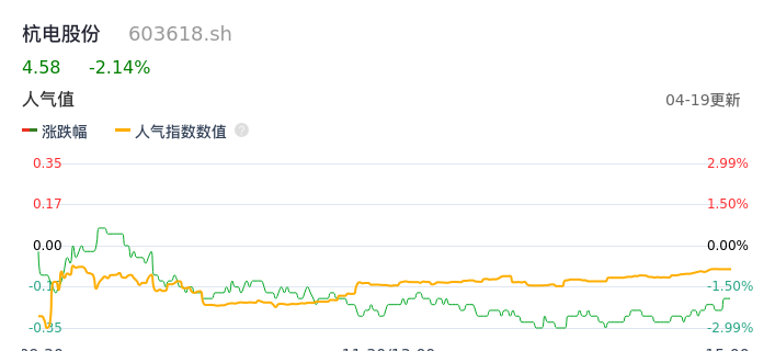 04月19日,杭电股份收报4.58,股价涨幅-2.14%,成交金额3750.56万元,换手率1.18%。