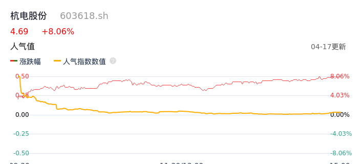 04月17日,杭电股份收报4.69,股价涨幅8.06%,成交金额7565.79万元,换手率2.39%。