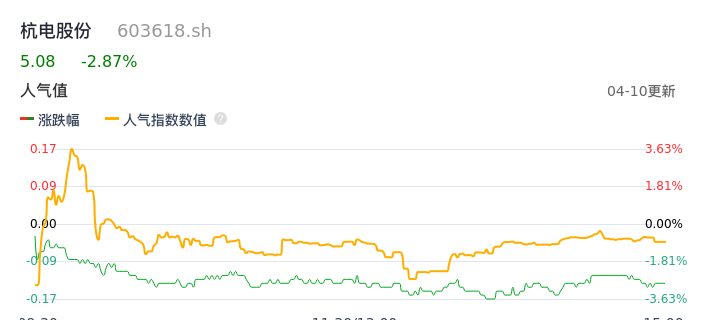04月10日,杭电股份收报5.08,股价涨幅-2.87%,成交金额4035.16万元,换手率1.15%。