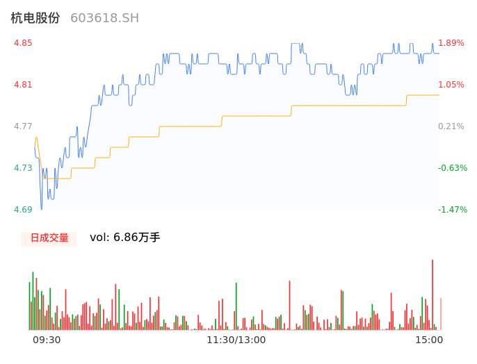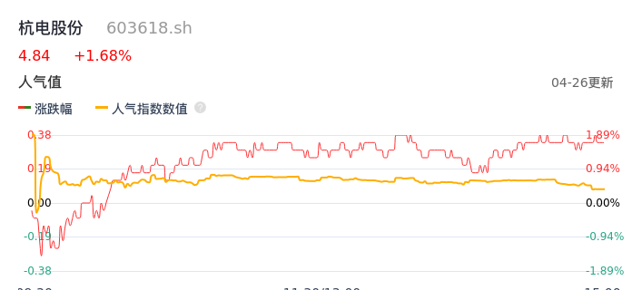 04月26日,杭电股份收报4.84,股价涨幅1.68%,成交金额3293.77万元,换手率0.99%。