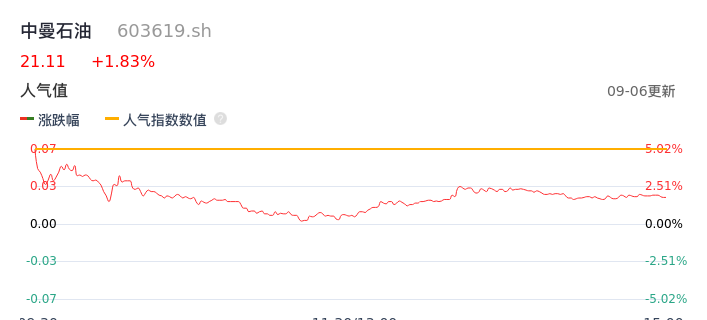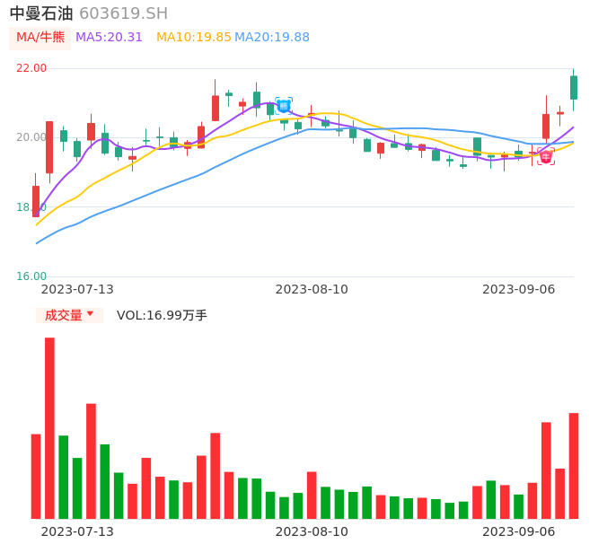 09月06日,中曼石油收报21.11,股价涨幅1.83%,成交金额3.62亿元,换手率4.25%。