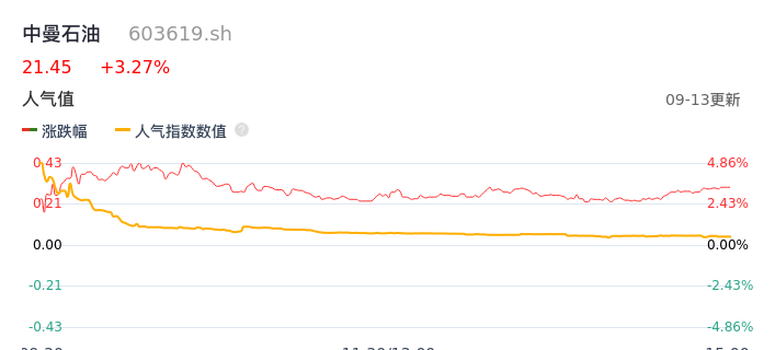 09月13日,中曼石油收报21.45,股价涨幅3.27%,成交金额3.40亿元,换手率3.95%。