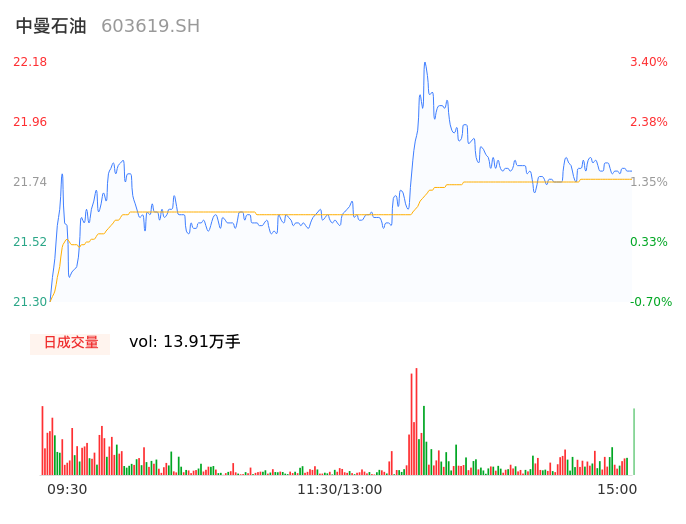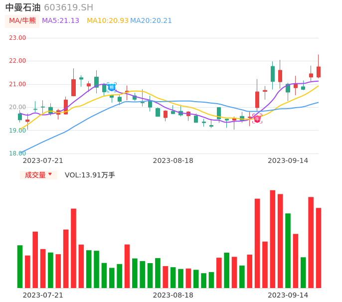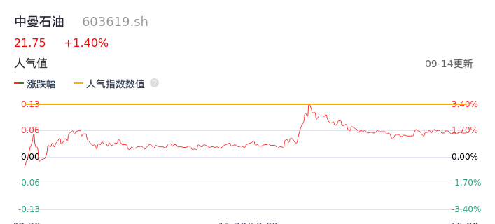 09月14日,中曼石油收报21.75,股价涨幅1.40%,成交金额3.02亿元,换手率3.48%。