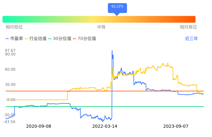 2023年09月07日,中曼石油上涨2.32%收于21.60,今日成交金额3.50亿元。下文将从市盈率PETTM、市净率PB、市现率3个角度去分析公司估值情况。