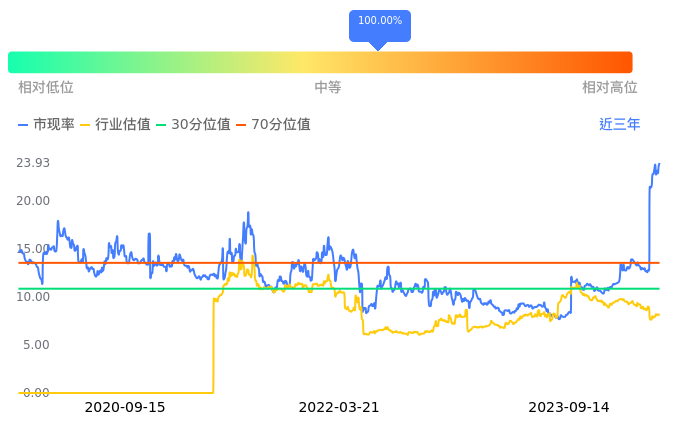 2023年09月14日,中曼石油上涨1.40%收于21.75,今日成交金额3.02亿元。下文将从市盈率PETTM、市净率PB、市现率3个角度去分析公司估值情况。