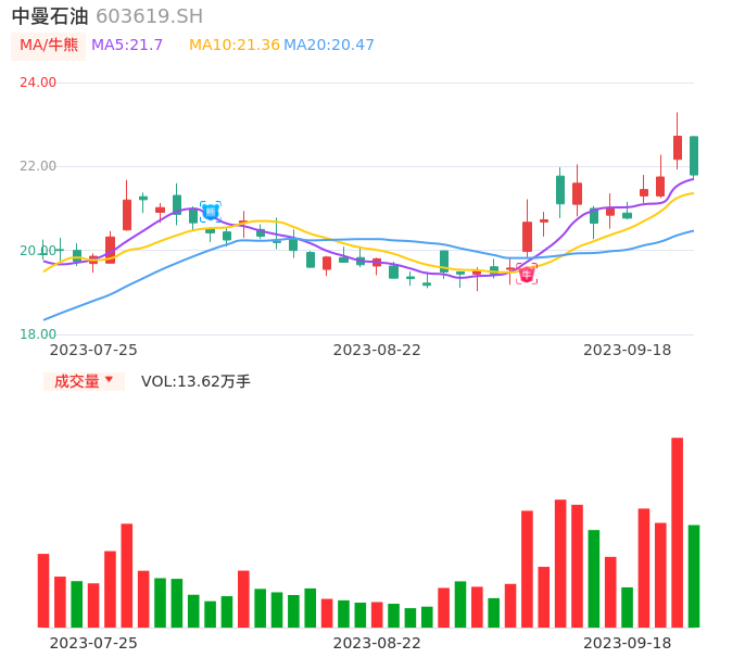 09月18日,中曼石油收报21.80,股价涨幅-4.05%,成交金额3.01亿元,换手率3.40%。