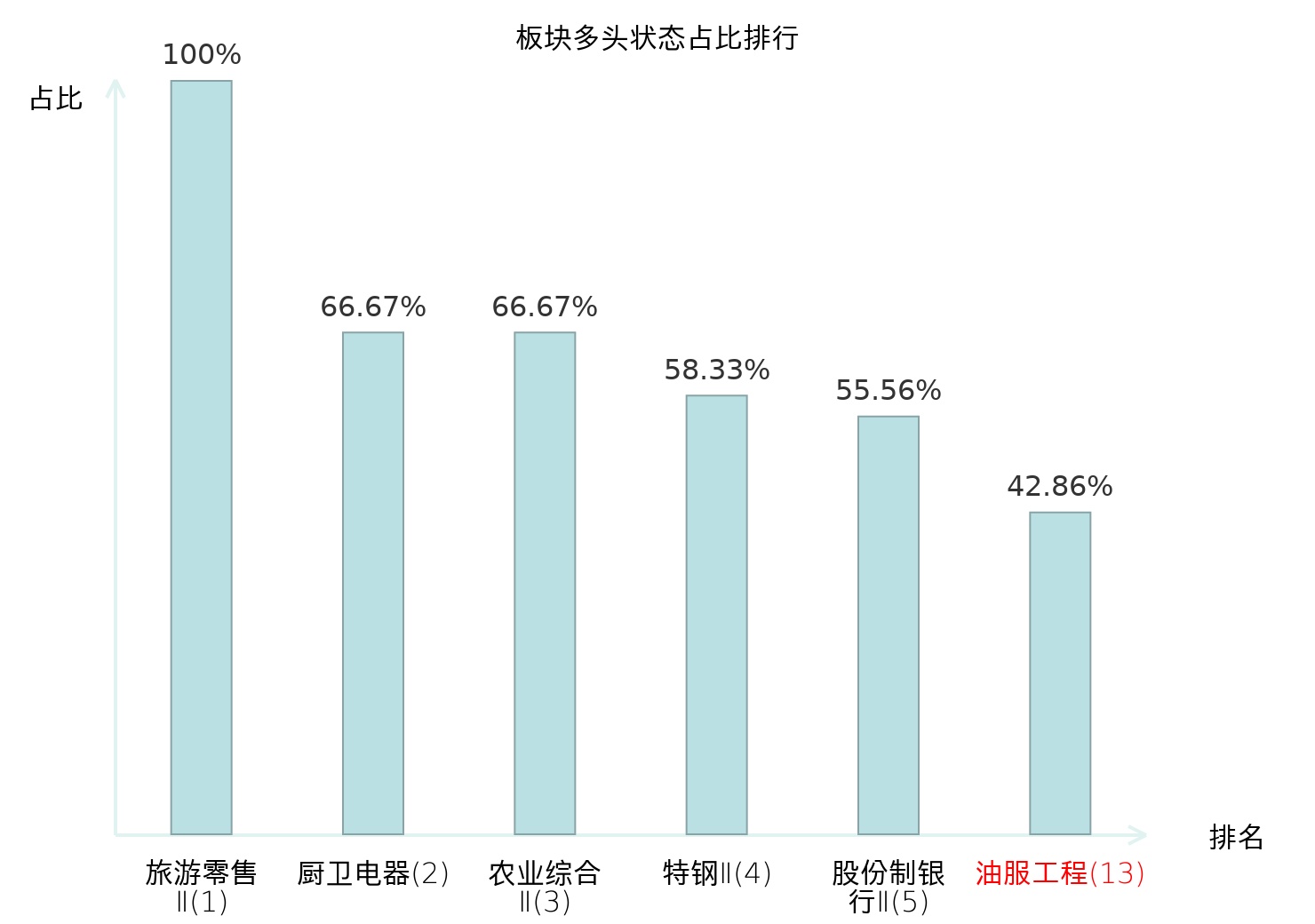 全市场所有行业板块中主力多头状态占比排名中,旅游零售Ⅱ板块位居第一。农商行Ⅱ板块名次提升最快,较昨日上升78位。