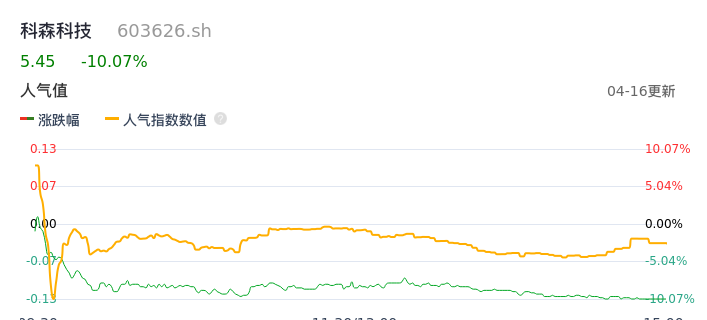 04月16日,科森科技收报5.45,股价涨幅-10.07%,成交金额2.26亿元,换手率7.27%。