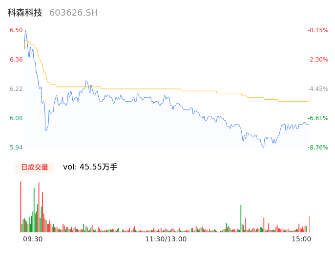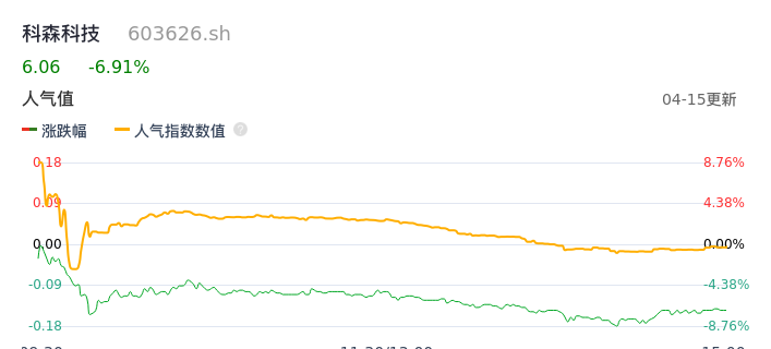 04月15日,科森科技收报6.06,股价涨幅-6.91%,成交金额2.80亿元,换手率8.21%。