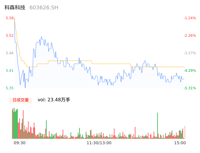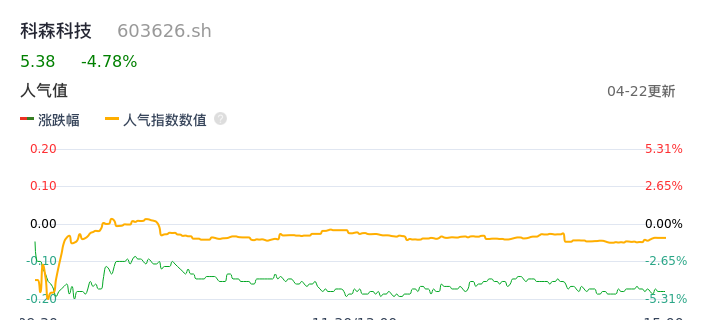 04月22日,科森科技收报5.38,股价涨幅-4.78%,成交金额1.27亿元,换手率4.23%。