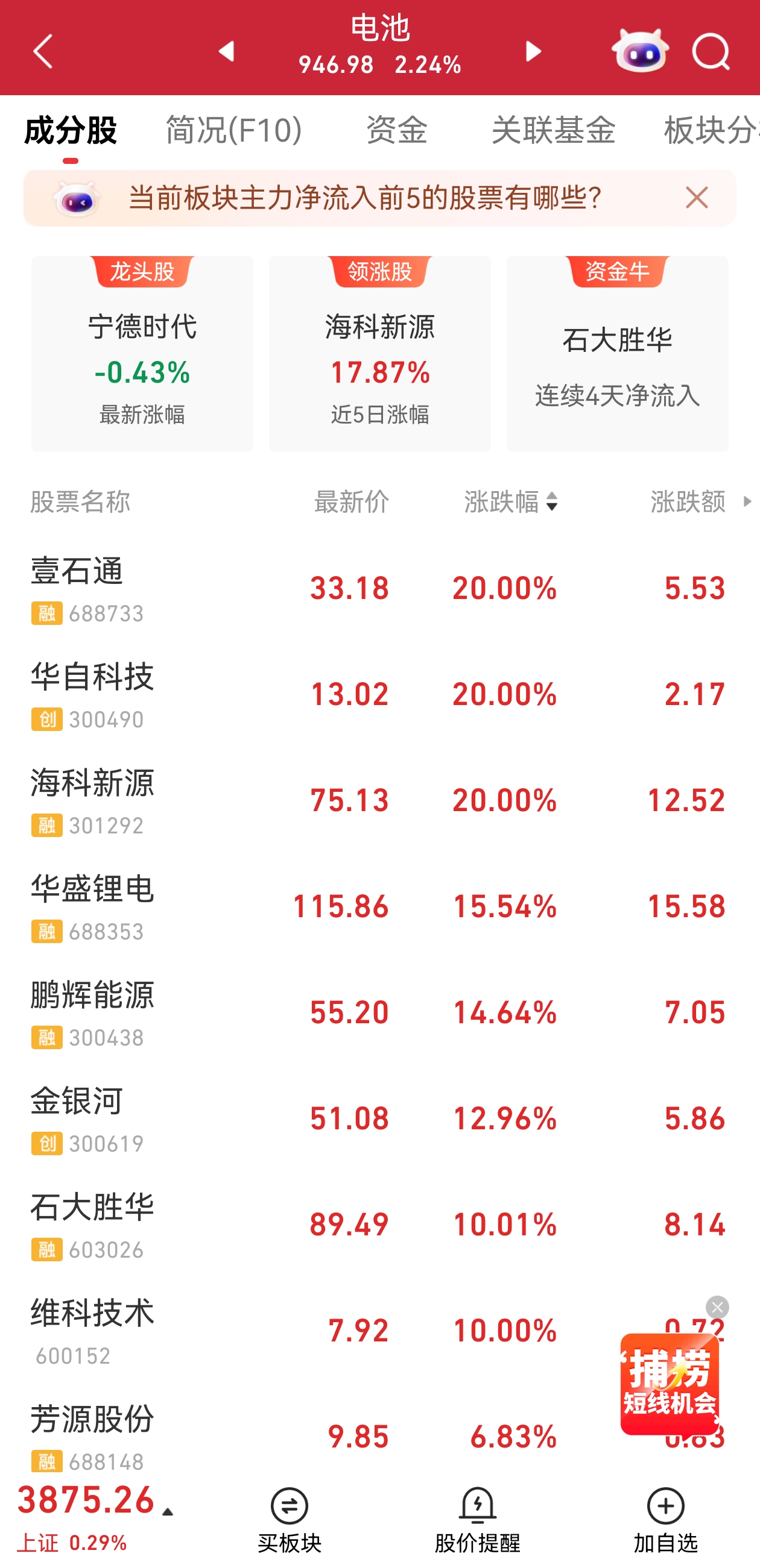 今日午后,电池板块全线上涨,锂电池电解液概念回暖,壹石通海科新源“20CM”涨停,石大胜华3分钟内直线拉升涨停。