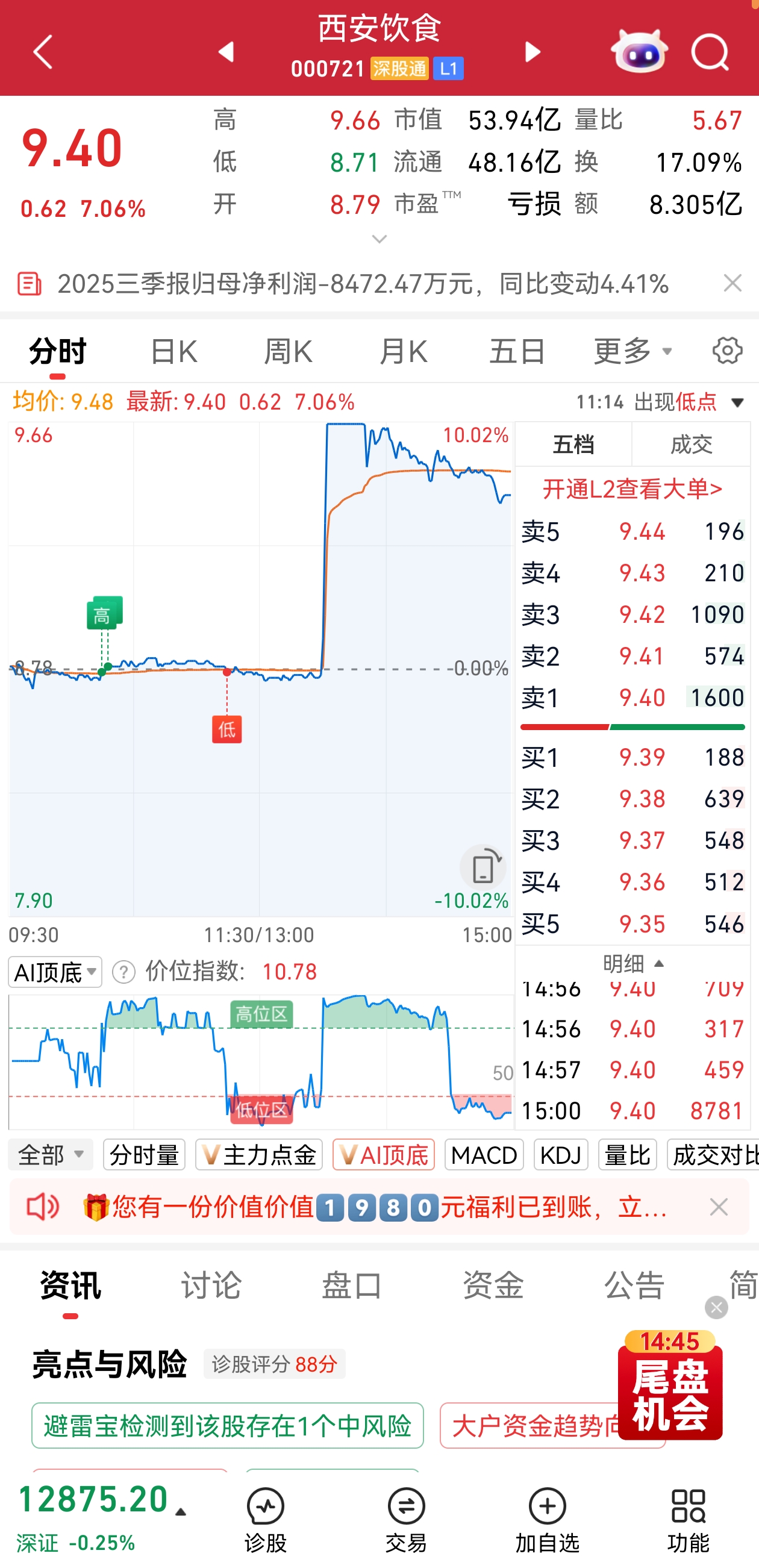 盘面上,陕西省出台深化资本市场改革助力陕西高质量发展的十六条措施,陕西国资股走强,西安饮食垂直拉升封板,2分钟内从下跌到涨停,截至收盘上涨7.06%。