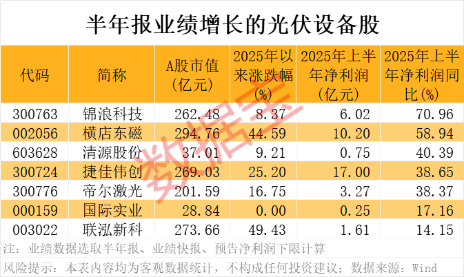 据证券时报·数据宝统计,根据目前披露的半年报业绩数据,按照半年报、业绩快报、预告净利润下限(无下限则取公告数值)计算,2025年上半年净利润为正值且同比增长的光伏设备股仅占少数,如锦浪科技、横店东磁、清源股份、捷佳伟创、帝尔激光等。