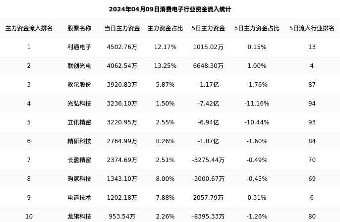 利通电子今日净流入4502.76万元,主力占比12.17%,在行业内排名:1/95;5日净流入1015.02万元,主力占比0.15%,在行业内排名:13/95。