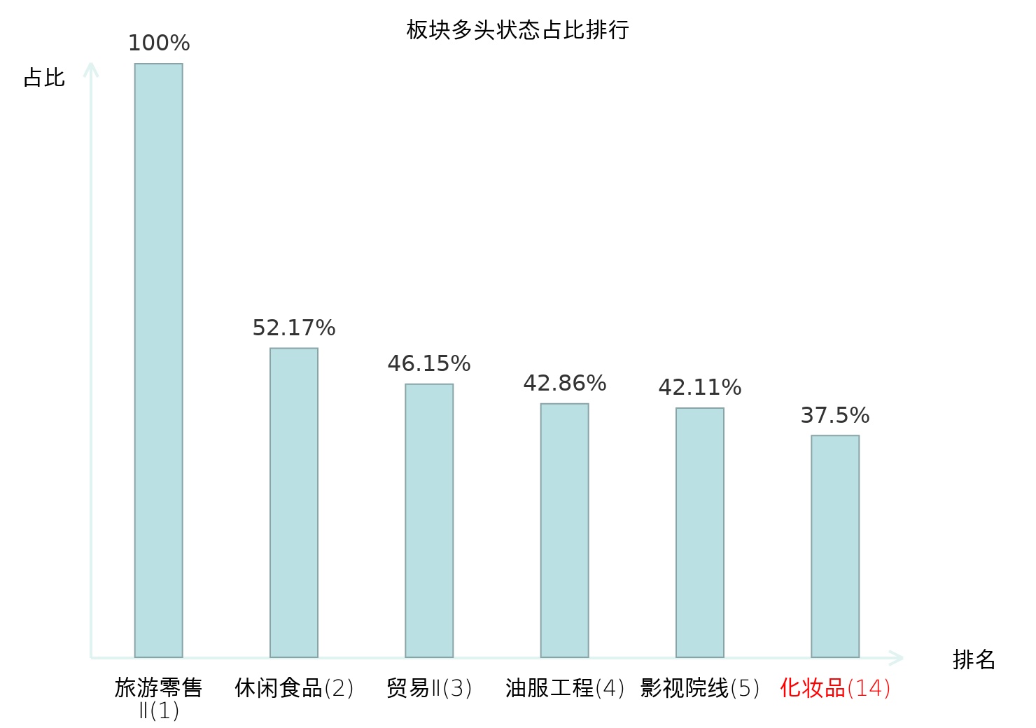 全市场所有行业板块中主力多头状态占比排名中,旅游零售Ⅱ板块位居第一。体育Ⅱ板块名次提升最快,较昨日上升99位。