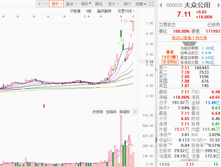 市场情绪:今日市场低开低走,高位题材股大面积杀跌,市场避险情绪浓厚,转道传统红利板块避险。沪深两市成交额2.52万亿,较上一个交易日缩量1376亿。今日共56股涨停,连板股总数10只,27股封板未遂,封板率为67%(不含ST股、退市股)。焦点股方面,创投概念股表现活跃,参股摩尔线程的大众公用与联美控股均走出9天5板,参股长江存储的养元饮品7天4板。此外,可控核聚变概念股合锻智能录得9天5板。