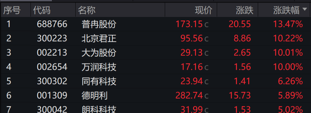 存储芯片板块表现活跃,普冉股份涨超10%,股价创历史新高,北京君正涨幅超10%,江波龙、香农芯创、德明利、同有科技、朗科科技等个股跟涨