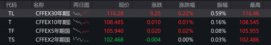 债市:多数上涨,30年期主力合约涨0.22%,报116.280元,10年期主力合约涨0.01%,报108.485元,5年期主力合约涨0.02%,报105.940元,2年期主力合约持平于102.468元。