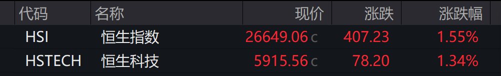 港股:截至收盘,恒生指数涨至1.55%,恒生科技指数收涨1.34%。