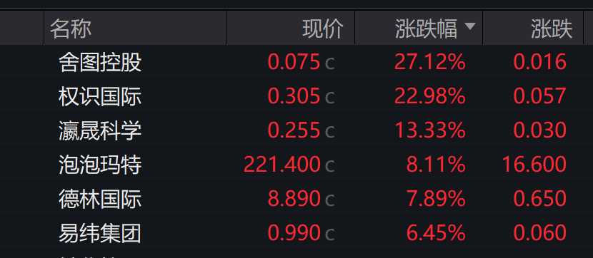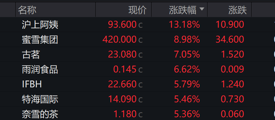 港股新消费概念走强,沪上阿姨涨超10%,泡泡玛特回升涨超6%,卫龙美味、奈雪的茶、茶百道、蜜雪集团等个股跟涨。