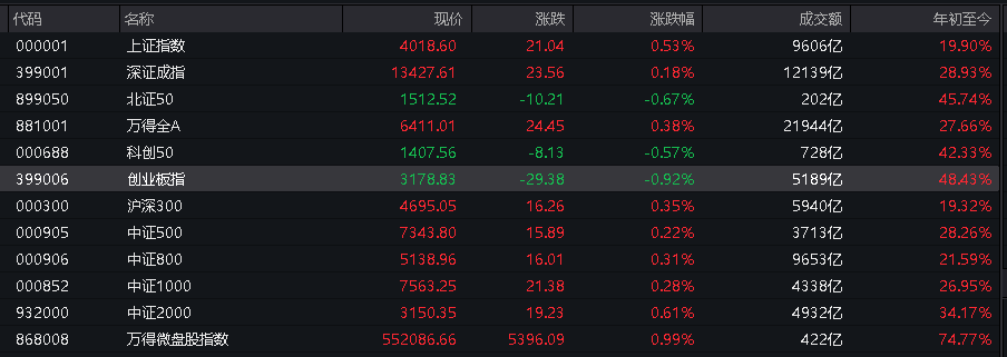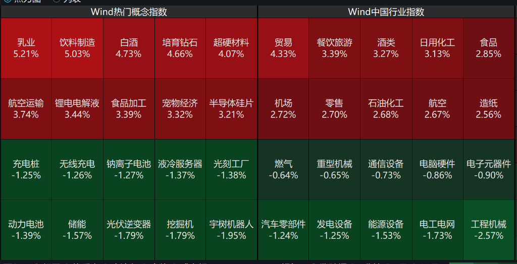 盘面上,个股涨多跌少,沪深京三市约3400股飘红,今日成交2.19万亿,较上日成交增长1754亿元。板块方面,大消费全面爆发,食品、白酒、免税店、旅游方向齐走强,化工股延续强势,硅能源概念股表现活跃,CPO、铜缆高速连接等算力硬件股多数下挫,人形机器人概念股表现不佳。