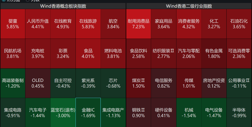 具体来看,消费股领涨,白酒、旅游、零售方向齐上涨;石油化工、黄金行业涨幅居前,科技股多数走高,腾讯涨超2%。个股方面,泡泡玛特涨逾8%,中海油涨近6%,比亚迪股份涨近4%。