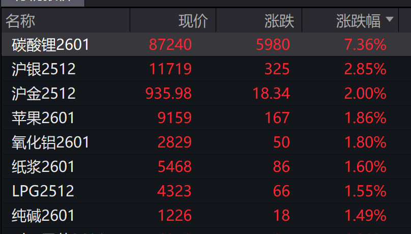 商品收盘多数上涨,碳酸锂涨7.36%,沪银涨2.85%,非金属建材跌幅居前,玻璃跌2.73%。
