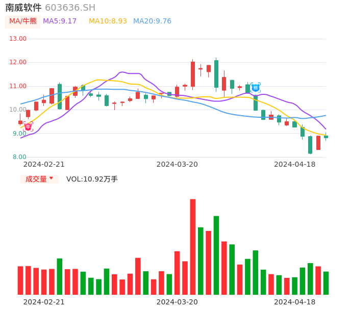 04月18日,南威软件收报8.81,股价涨幅-0.90%,成交金额9675.37万元,换手率1.85%。