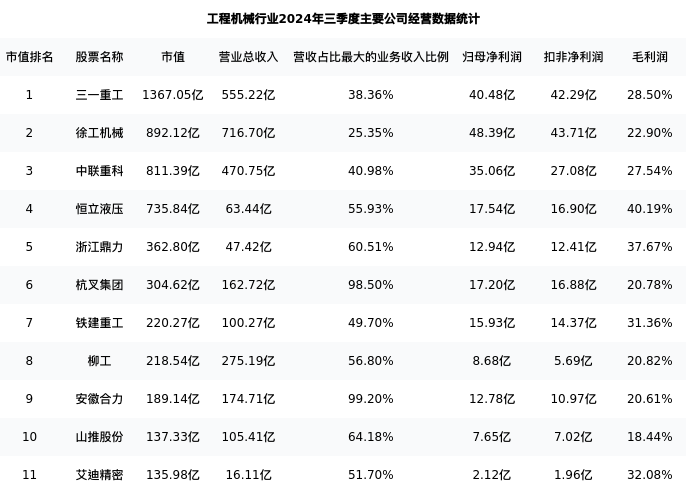 艾迪精密最新报告期数据为三季度,下表汇总了工程机械行业内市值靠前的公司三季度主要经营数据