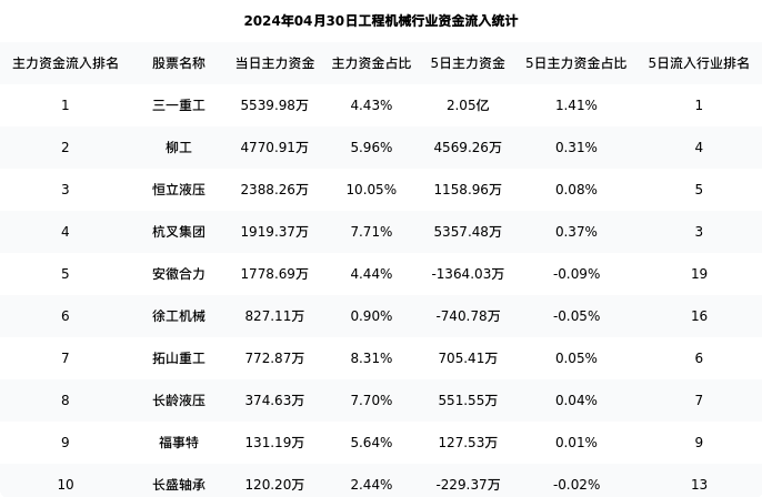 从主力资金流向来看,工程机械行业今日主力资金流入19.43亿元,在所有申万二级行业中排名:8/131。