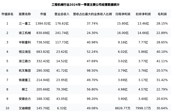 艾迪精密最新报告期数据为一季度,下表汇总了工程机械行业内市值靠前的公司一季度主要经营数据