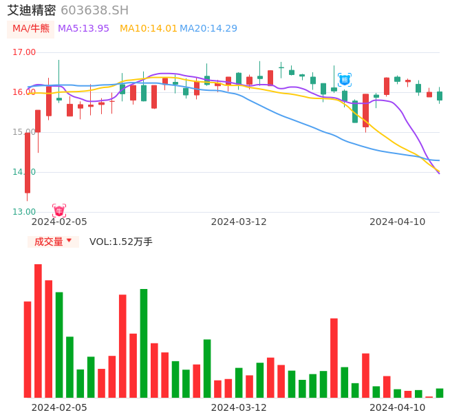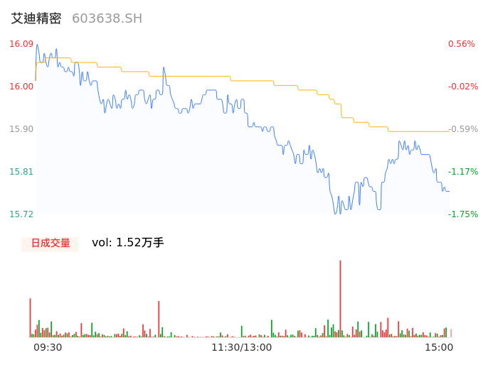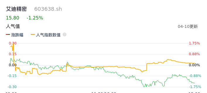 04月10日,艾迪精密收报15.80,股价涨幅-1.25%,成交金额2410.78万元,换手率0.18%。