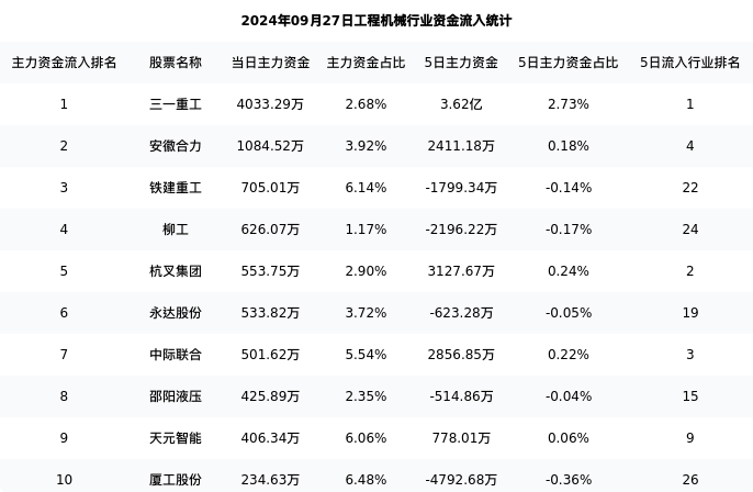 从主力资金流向来看,工程机械行业今日主力资金流入21.60亿,在所有申万二级行业中排名:82/131。