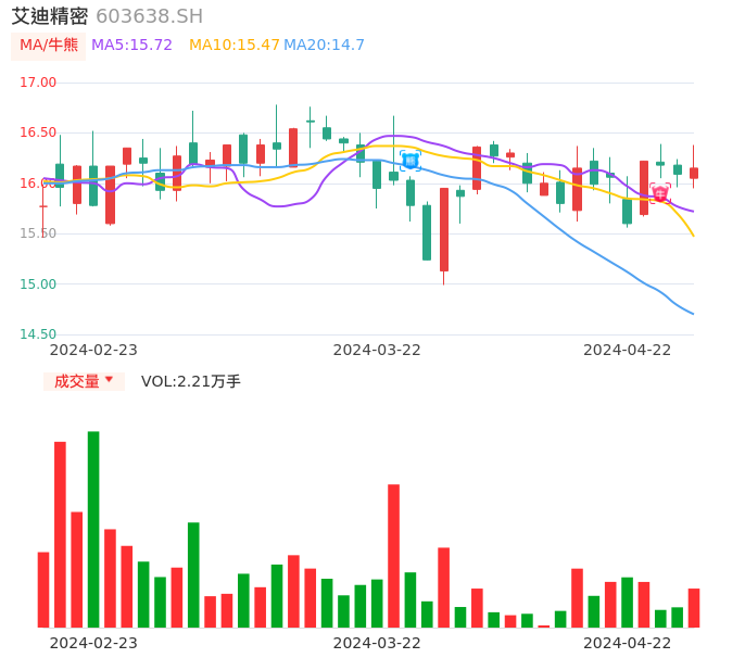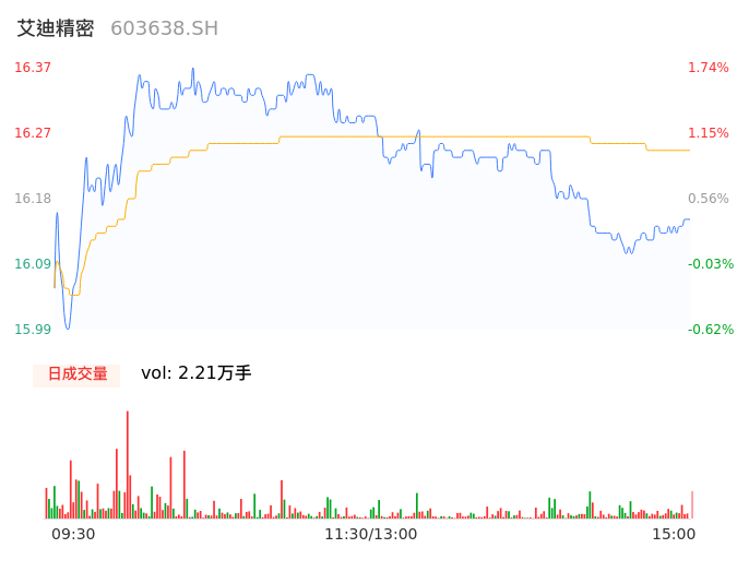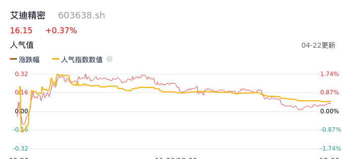04月22日,艾迪精密收报16.15,股价涨幅0.37%,成交金额3589.26万元,换手率0.26%。