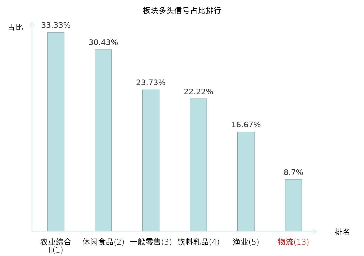 全市场所有行业板块中主力多头信号占比排名中,农业综合Ⅱ板块位居第一。农业综合Ⅱ板块名次提升最快,较昨日上升129位。