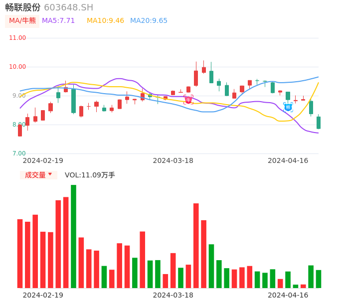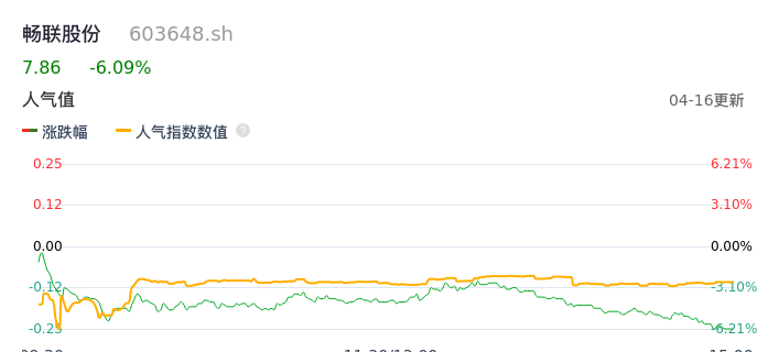 04月16日,畅联股份收报7.86,股价涨幅-6.09%,成交金额8902.60万元,换手率3.06%。